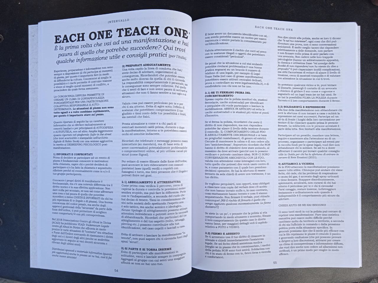 Conoscere i propri diritti di manifestante è fondamentale, ma c'è una notevole differenza tra il diritto teorico e la sua effettiva applicazione. Non dare nulla per scontato, se non sai come affrontare una cosa o hai paura di quello che potrebbe succedere o meno CHIEDI E INFORMATI da chi ha più esperienza di te (legale o di piazza). Una buona conoscenza del codice penale, ma anche degli approcci gestioniali della “sicurezza” da parte delle forze dell’ordine, ti può permettere di scegliere come comportarti/vi con più consapevolezza.